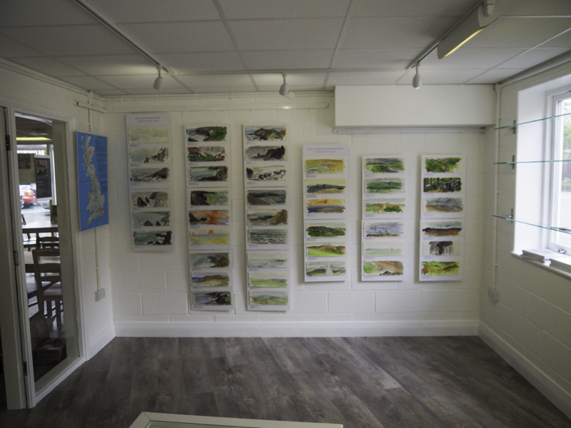 The 'End to End Trail' exhibition is designed to be easily installed with a wide range of display options available. The exhibition consists of 126 paintings mounted on 42 A2 foam boards with 3 paintings on each board. As they are lightweight boards, minimal hanging facilities are required. Each board is 420mm wide and has two 15mm 'D' rings spaced 300mm apart. The boards can be hung directly on STAS or similar hanging systems. They are designed so that it is possible to connect boards vertically as required with hidden connectors. Each board is 594mm high