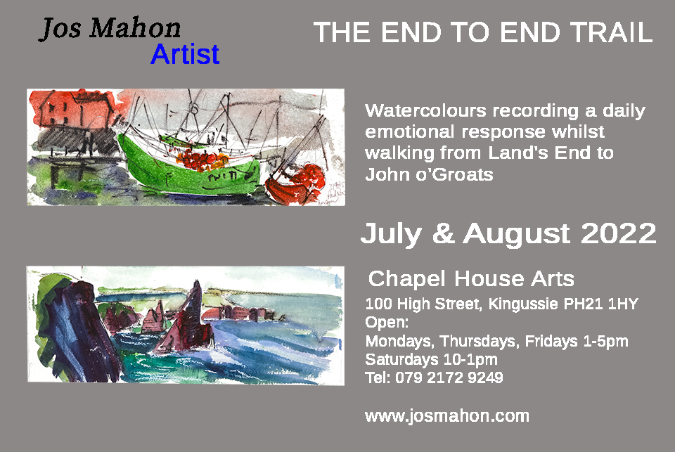 The paintings in this exhibition are a selection from a large body of work Jos made whilst walking the entire length of the country, the End to End, from Land’s End in Cornwall to John o’ Groats, at the top of Scotland.